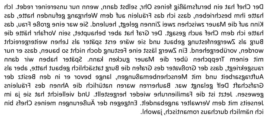 „Ich beginne mit dem Fräulein, die habe ich auch als erstes gefunden. Sie stand auf dem Wehrgang, an der Westseite, wo man ins Tal sehen kann. Ich dachte erst, die will da rausspringen; aber wozu, so als Gespenst. Besoffen war sie auch nicht, aber sie stand wie besoffen. Hielt sich links und rechts an den Zinnen fest, das Kinn auf der Mauer dazwischen. Und heulte, meine Güte, heulte, als wollte sie die Mauer erweichen. Vorn liefen die Tränen literweise, und von ihrem Rücken lief literweise Blut. Ein Dolch war auch reingepflanzt.“